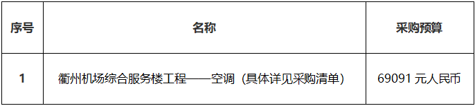 根據(jù)《衢州市市屬國(guó)有企業(yè)采購(gòu)管理辦法(試行)》規(guī)定,以公開(kāi)詢價(jià)方式對(duì)衢州機(jī)場(chǎng)綜合服務(wù)樓工程——空調(diào)進(jìn)行采購(gòu),歡迎合格的供應(yīng)商參加。